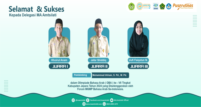 Apresiasi kepada siswa-siswi berprestasi MA Amtsilati. F-MGMP (Forum Musyawarah Guru Mata Pelajaran) mengumumkan penyelenggaraan Olimpiade Bahasa Arab (OBA) ke-VII tingkat Kabupaten/Kota tahun 2024.